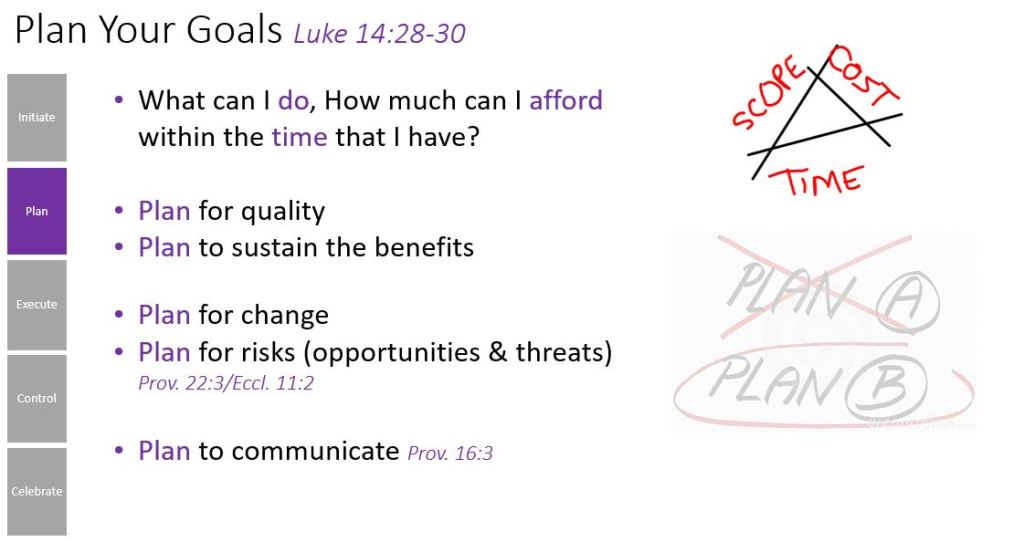 Plan for risks, threats and opportunities. In the Initiate your goals post, sharing your plans with others will help you to identify the risks that you perhaps did not think of yourself.